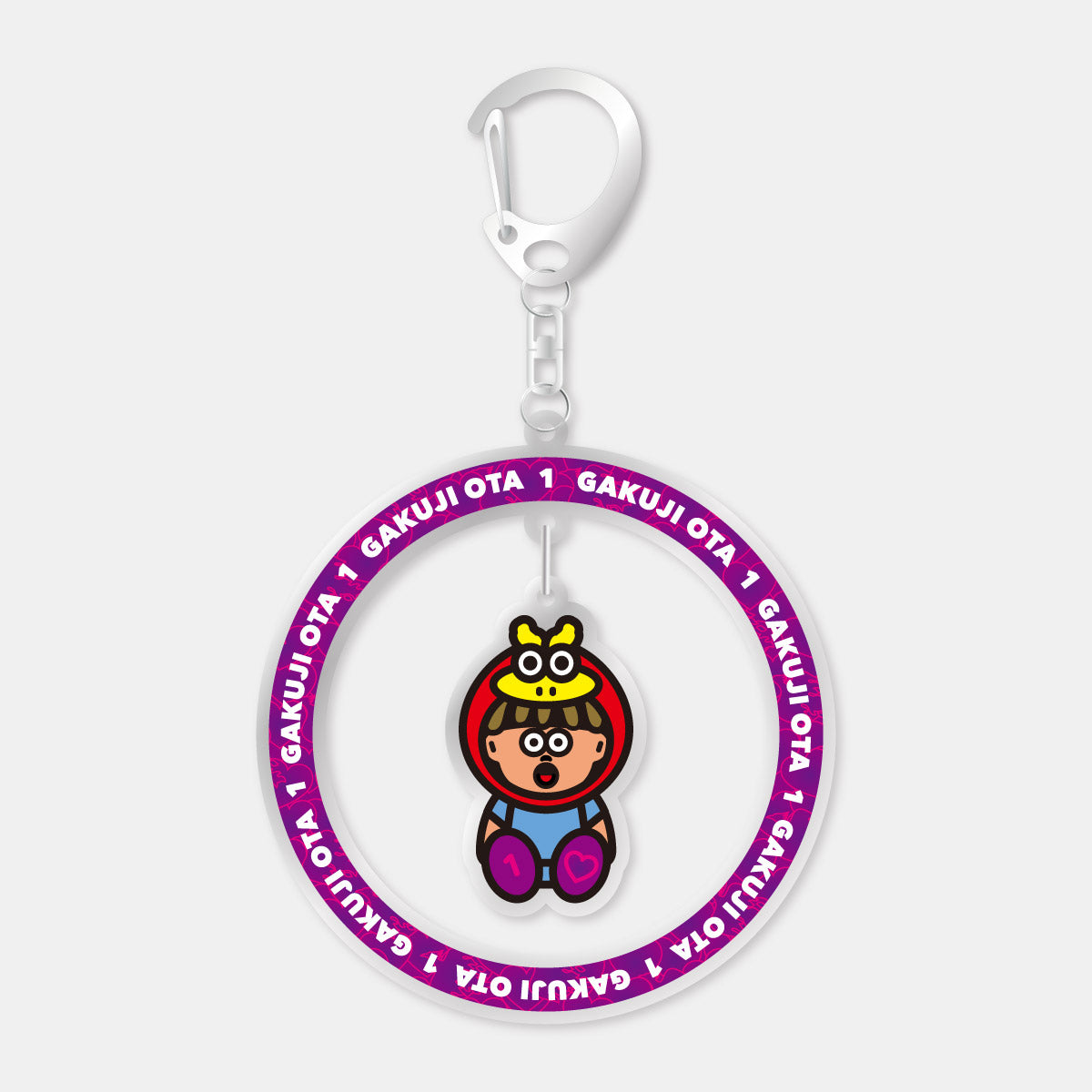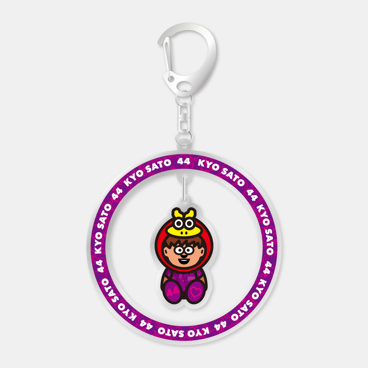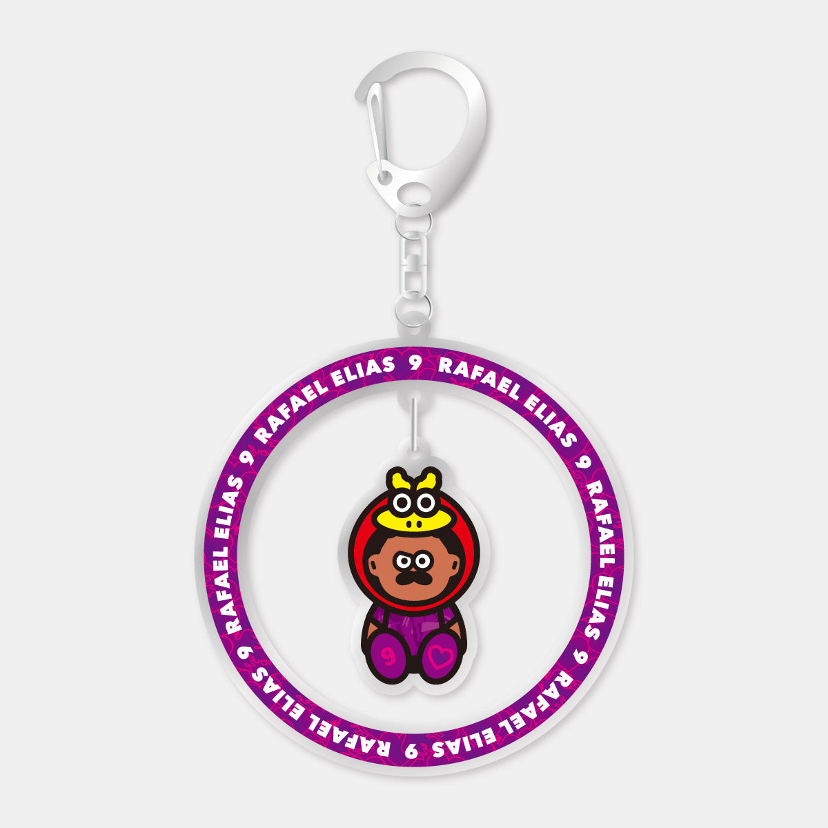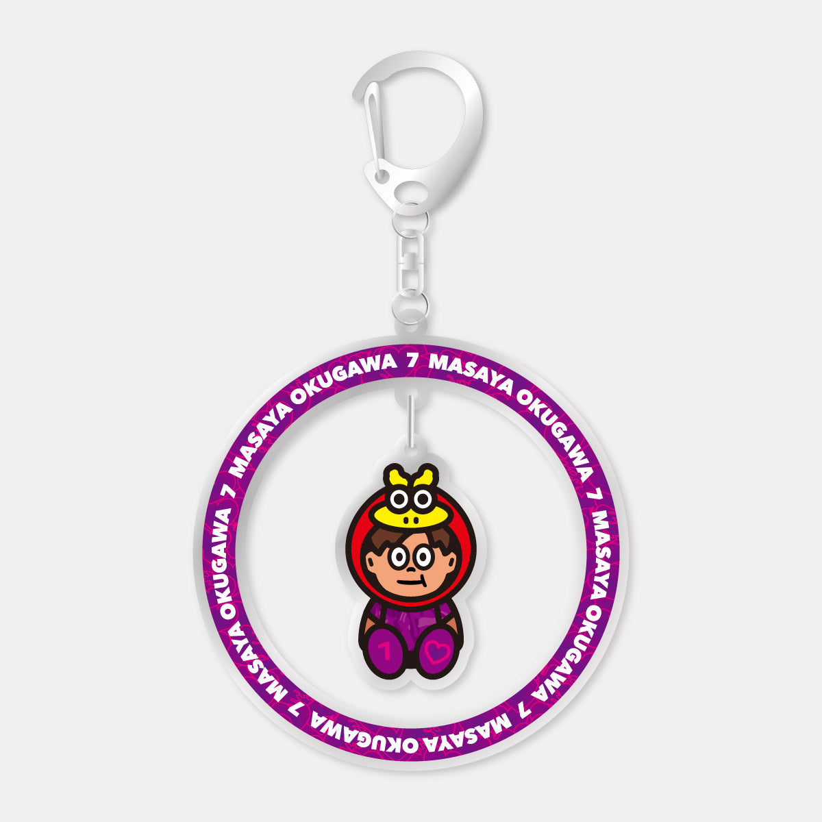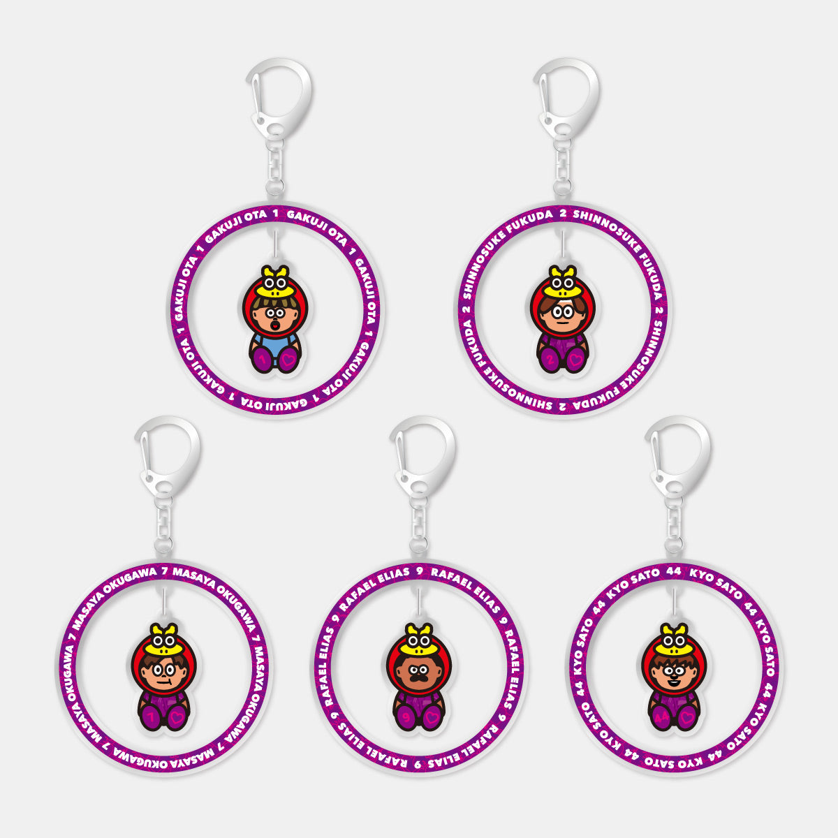 選手の名前と背番号がデザインされたパープルのリング中でゆらゆら選手が揺れるデザインのキーホルダーは、存在感抜群◎